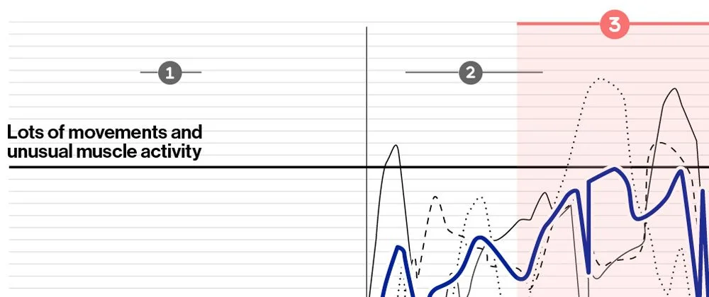 The graph shows the amount of movement and unusual muscle activity during the time of the measurement. It includes a separate line for each day of measurement as well as a line showing the average value for all days of measurement indicating certain trends or commonalities.
